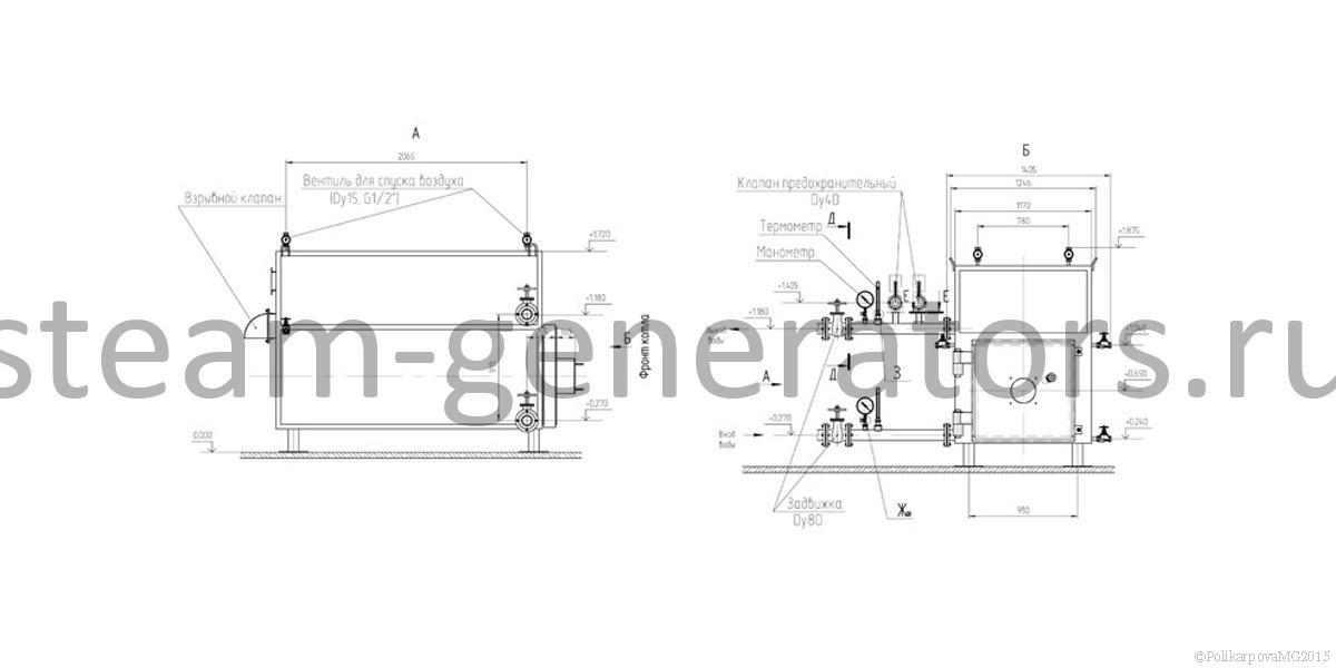 Котел поставляется максимальной монтажной готовности. Котельный блок устанавливается на ровную поверхность, подключается теплоноситель, горелка, настраивается автоматика, КИП и запорная арматура, сверху подводится газоход. Котлы с импортными горелками работают под наддувом. С некоторыми отечественными горелками вам может потребоваться установка дымососа.