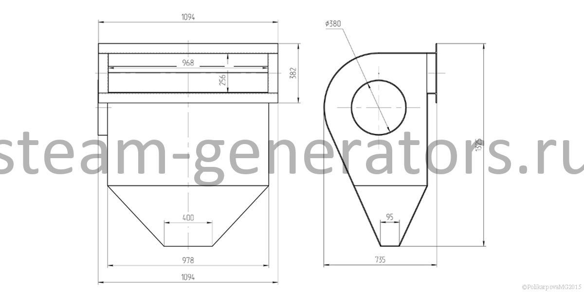 Очищенные дымовые газы отводятся из золоуловителя по патрубку через круглое выходное отверстие на боковой стенке, поступают в газоходы котельной и через дымовую трубу удаляются наружу котельной.