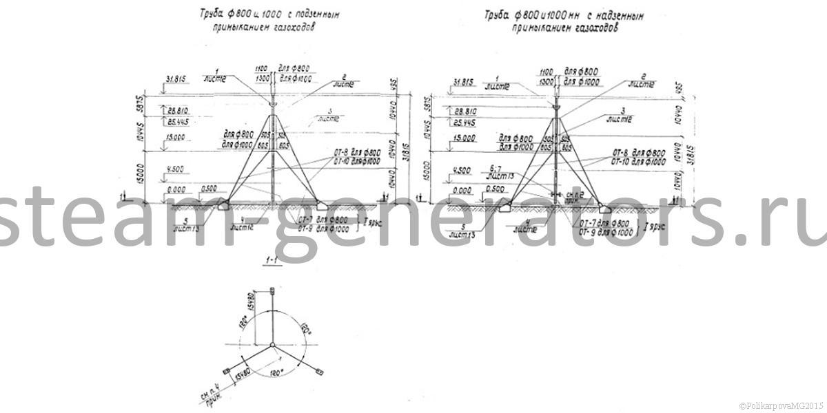 Монтаж дымовых труб на растяжках 1000 производится в соответствии с проектом производства работ, разработанным специализированной организацией. При монтаже труб высотой 31,815 м рекомендуется монтаж с помощью гусеничного и пневмоколесного крана. При установки трубы методом опрокидывания металлоконструкции и фундаменты должны быть проверены на монтажные нагрузки и при необходимости усилены на время монтажа.