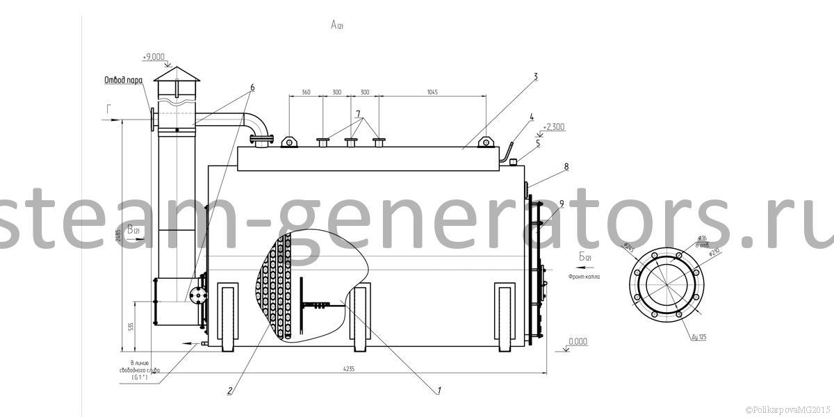 Угольный парогенератор 700 кг/ч - промышленный парогенератор высокого давления, паропроизводительностью 700 кг/час, давлением 0,3 - 0,8 МПа (8,0 кгс/см2) и температурой пара до 170 °С. Цена указана в полной комплектации.