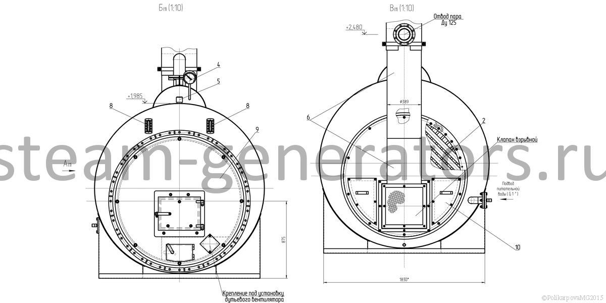 Угольный парогенератор 1000 кг/ч комплектуется манометром, уровнемерной колонкой, указателем уровня, двумя предохранительными клапанами, паровыми и продувочными вентилями, дымовой трубой, колосниками, вентилятором поддува, автоматикой. Дымосос для работы котла не требуется. Насос поставляется отдельно.