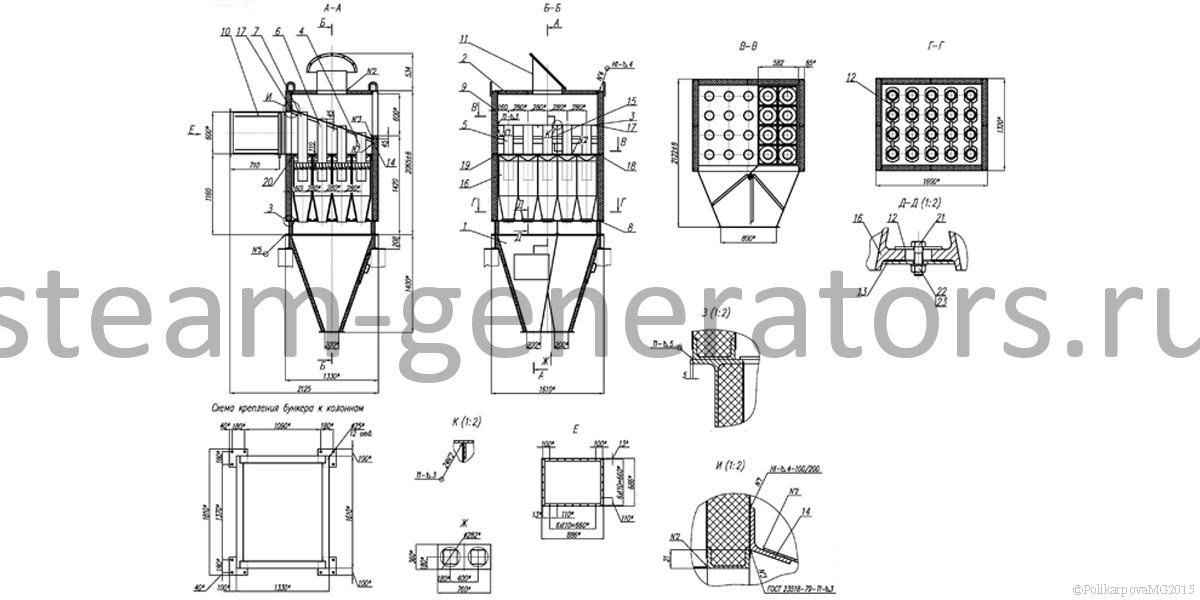 Кроме того, секционирование исключает переток газов из одних элементов в другие через пылевой бункер. В каждой секции на крышках установлены предохранительные клапаны во избежание повреждения циклона при взрывах или хлопках в процессе очистки взрывоопасных пылегазовых смесей. Корпус и бункер батарейного циклона БЦ 2-4х(3+2) изготовляют сварными из листовой стали. Сварные швы корпусов батарейного циклона обеспечивают газоплотность всего циклона.