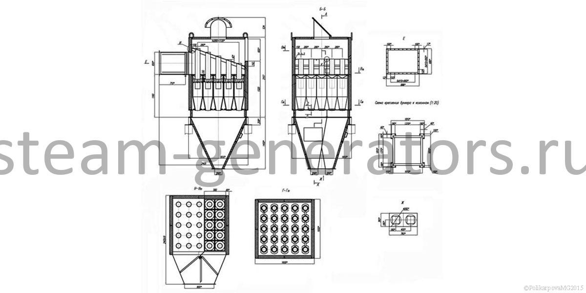Кроме того, секционирование исключает переток газов из одних элементов в другие через пылевой бункер. В каждой секции на крышках установлены предохранительные клапаны во избежание повреждения циклона при взрывах или хлопках в процессе очистки взрывоопасных пылегазовых смесей. Корпус и бункер батарейного циклона БЦ-2-5х(3+2) изготовляют сварными из листовой стали. Сварные швы корпусов батарейного циклона обеспечивают газоплотность всего циклона.