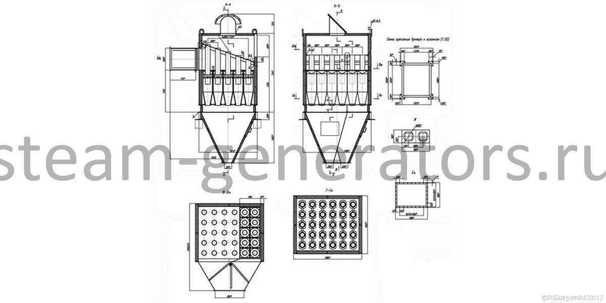Кроме того, секционирование исключает переток газов из одних элементов в другие через пылевой бункер. В каждой секции на крышках установлены предохранительные клапаны во избежание повреждения циклона при взрывах или хлопках в процессе очистки взрывоопасных пылегазовых смесей. Корпус и бункер батарейного циклона БЦ 2-5х(4+2) изготовляют сварными из листовой стали. Сварные швы корпусов батарейного циклона обеспечивают газоплотность всего циклона.