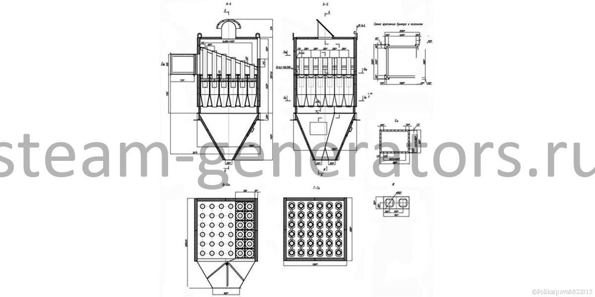 Кроме того, секционирование исключает переток газов из одних элементов в другие через пылевой бункер. В каждой секции на крышках установлены предохранительные клапаны во избежание повреждения циклона при взрывах или хлопках в процессе очистки взрывоопасных пылегазовых смесей. Корпус и бункер батарейного циклона БЦ 2-6х(4+2) изготовляют сварными из листовой стали. Сварные швы корпусов батарейного циклона обеспечивают газоплотность всего циклона.