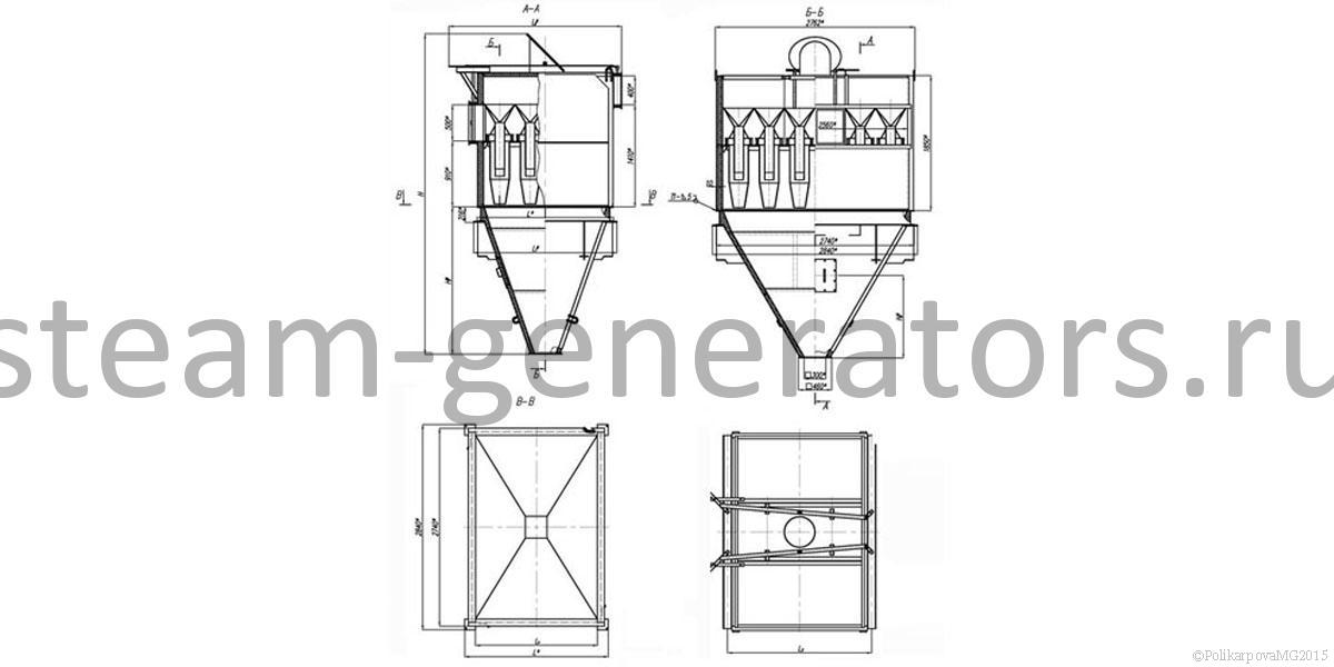 Батарейный циклон БЦ 259-(6x5) собирается из батарей циклонных элементов объединенных под общим корпусом, имеющих сборный бункер, общий отвод и подвод газов, которые обеспечивают надежную работу установки при работе котлов на многозольных топливах.
