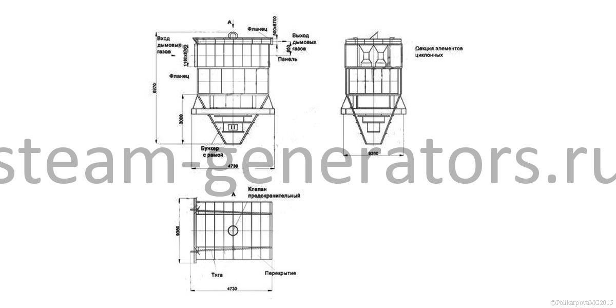 Выхлопная труба элемента заканчивается вверху переходным конфузорным патрубком прямоугольного сечения 640х700 мм с углами наклона сторон более 60°С. Сваренные между собой переходные патрубки образуют верхнюю трубную доску. Отсутствие отложений золы и пыли на верхней трубной доске является одним из преимуществ данной конструкции.