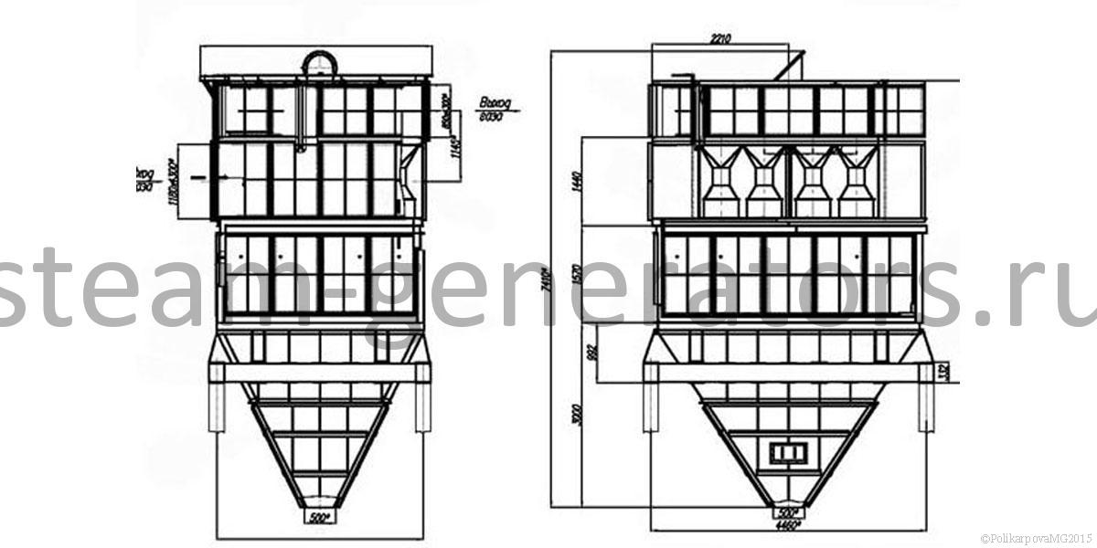 Выхлопная труба элемента заканчивается вверху переходным конфузорным патрубком прямоугольного сечения 640х700 мм с углами наклона сторон более 60°С. Сваренные между собой переходные патрубки образуют верхнюю трубную доску. Отсутствие отложений золы и пыли на верхней трубной доске является одним из преимуществ данной конструкции.