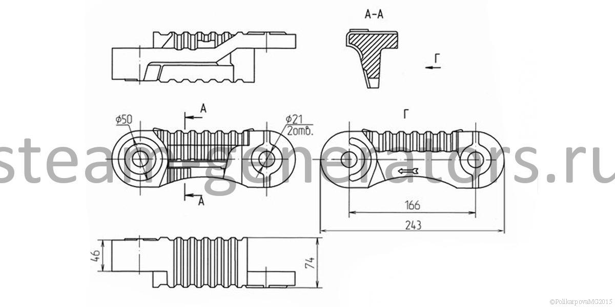 Колосник ведущий правый Т 24.06.004 (00.1603.057) это чугунная отливка сложной конфигурации с соединительными ребрами и отверстиями, соединяющийся с другими колосниками поперечными штырями в цельное колосниковое полотно, натягиваемое на валы и перемещаемое приводом топки. Колосник ведущий правый Т 24.06.004 является тяговым элементом и находится в зацеплении со звездочками.