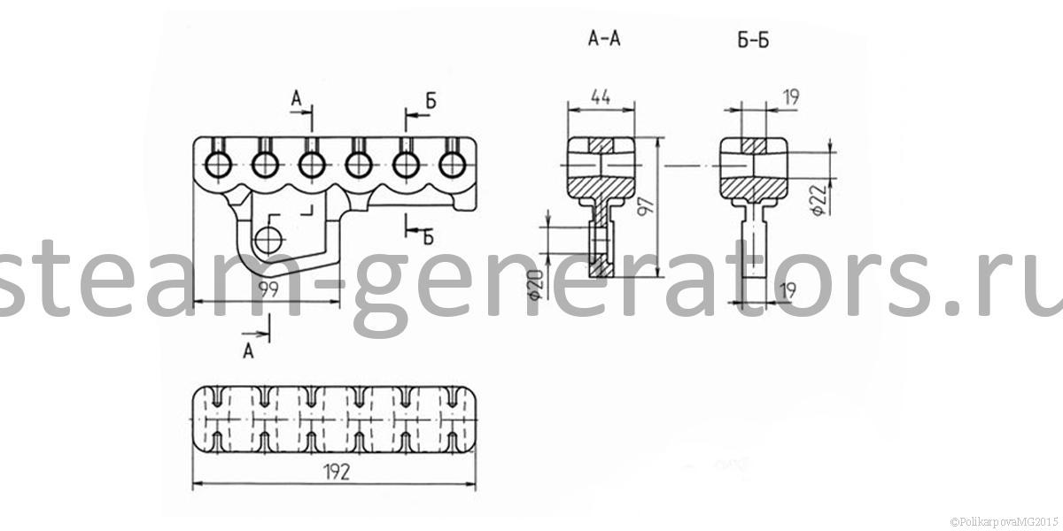 Держатель средний 6.30.2 (6 отверстий) (00.7003.003) - это чугунная отливка сложной формы, в которой предусмотрены отверстия для крепления к движущейся цепи и отверстия для крепления на них колосников.
