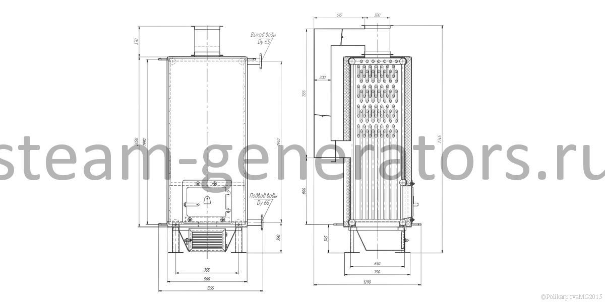 Гладкотрубный, горизонтальной компоновки. Впереди располагается колосниковая топка с зольником, сзади двухходовой конвективный блок. Топочное пространство выполнено газоплотным. Газоплотность топки обеспечивается при помощи вварки стальной полосы между охлаждаемых труб котла и исключает присосы холодного воздуха в топочную камеру и зону горения топлива. Воздух для горения топлива поступает исключительно снизу из зольника. Снаружи котел имеет каркас с установленной на нем теплоизоляцией и обшитый стальными листами. Изоляция котла обеспечивает температуру наружной стенки не более 30 °С, выполняется из плит ПТЭ, устанавливаемых на трубную систему. Подвод и отвод воды выполнен сверху котла, выход газов также производится сверху. Для растопки котла и вывода его в режим самотяги, сверху сбоку котла устанавливается обводной газоход.