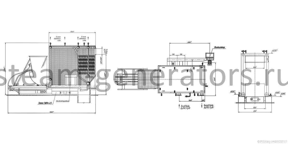 Котел поставляется максимальной монтажной готовности. Котельный блок устанавливается на топку ТШПМ, подключается теплоноситель, КИП и запорная арматура, сверху подводится газоход. Для отвода дымовых газов к газоходу подсоединяется дымосос. Воздух подается в топочную камеру через распределительную решетку топки вентилятором.