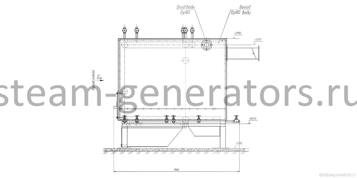Гладкотрубный, горизонтальной компоновки. Впереди располагается колосниковая топка с зольником, сзади двухходовой конвективный блок. Топочное пространство выполнено газоплотным. Газоплотность топки обеспечивается при помощи вварки стальной полосы между охлаждаемых труб котла и исключает присосы холодного воздуха в топочную камеру и зону горения топлива. Воздух для горения топлива поступает исключительно снизу из зольника. Снаружи котел имеет каркас с установленной на нем теплоизоляцией и обшитый стальными листами. Изоляция котла обеспечивает температуру наружной стенки не более 30 °С, выполняется из плит ПТЭ, устанавливаемых на трубную систему. Подвод и отвод воды выполнен сверху котла, выход газов также производится сверху. Для растопки котла и вывода его в режим самотяги, сверху сбоку котла устанавливается обводной газоход.