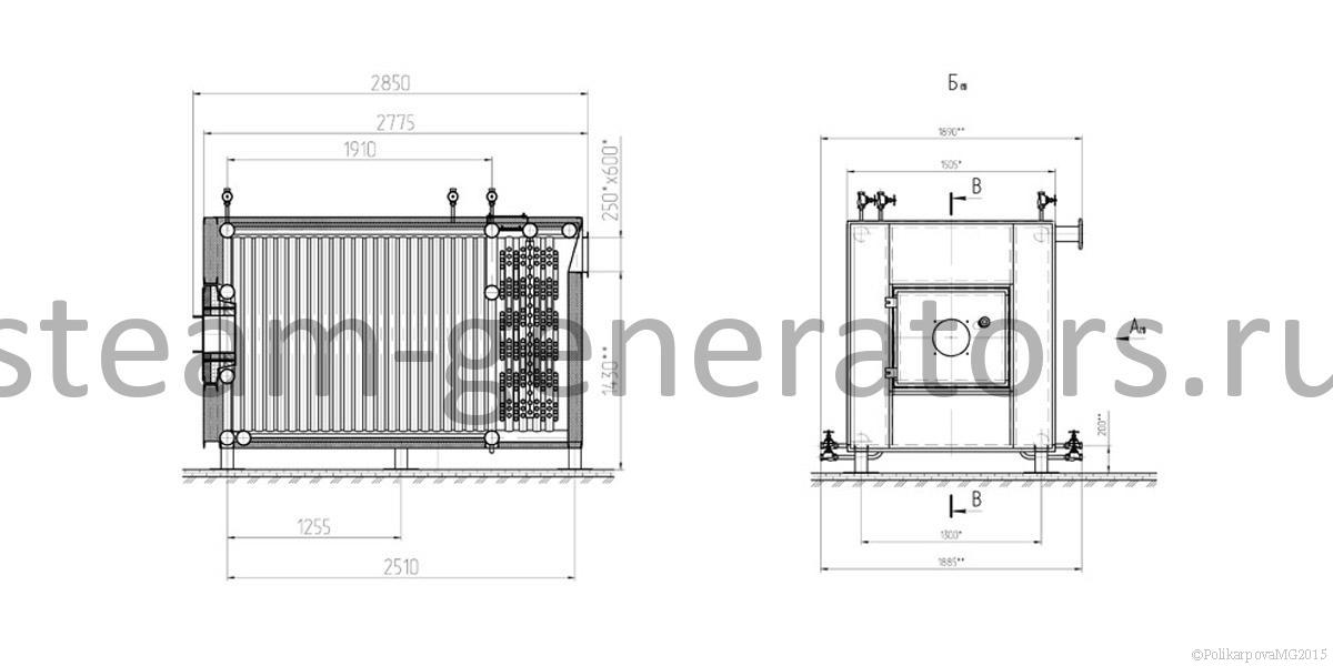 Гладкотрубный, горизонтальной компоновки. В передней части котла имеется топка, в задней, либо верхней части двухходовой конвективный пакет. Топочное пространство газоплотное. Газоплотность топки обеспечивается при помощи вварки стальной полосы между охлаждаемых труб котла. Конвективные пакеты выполняются в виде плотных регистров и вставляются в котле друг напротив друга в шахматном порядке. Устроенная таким образом поверхность нагрева имеет обширную полезную площадь, участвующую в передаче тепла, и максимальный коэффициент теплопередачи, горячие дымовые газы на выходе из котла охлаждаются до температуры 160-180 °С, в зависимости от вида топлива. Кроме того, организация данным образом трубной системы котла обеспечивает его компактность.