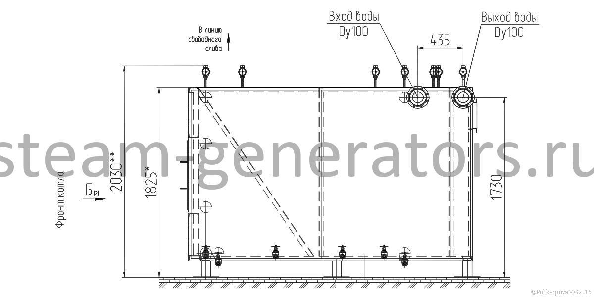 Водогрейный газовый котел 800 кВт имеет гладкотрубную трубную систему и незначительный водяной объем, он безопасен в эксплуатации, взрывоопасность котла в любых аварийных ситуациях отсутствует. Сзади котел оснащен взрывным клапаном.