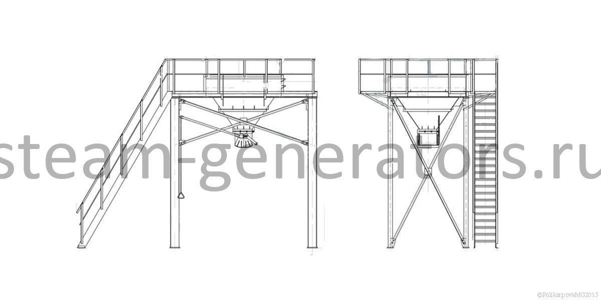 Бункер золы и шлака состоит из бункера, опор, питательного механизма, площадок для обслуживания и затвора. Объем бункера шлака рассчитывается в зависимости от мощности модульной котельной и вида сжигаемого топлива, для бурых углей он должен быть больше. Бункер шлака и золы может изготавливаться как с опорами, так и без них.