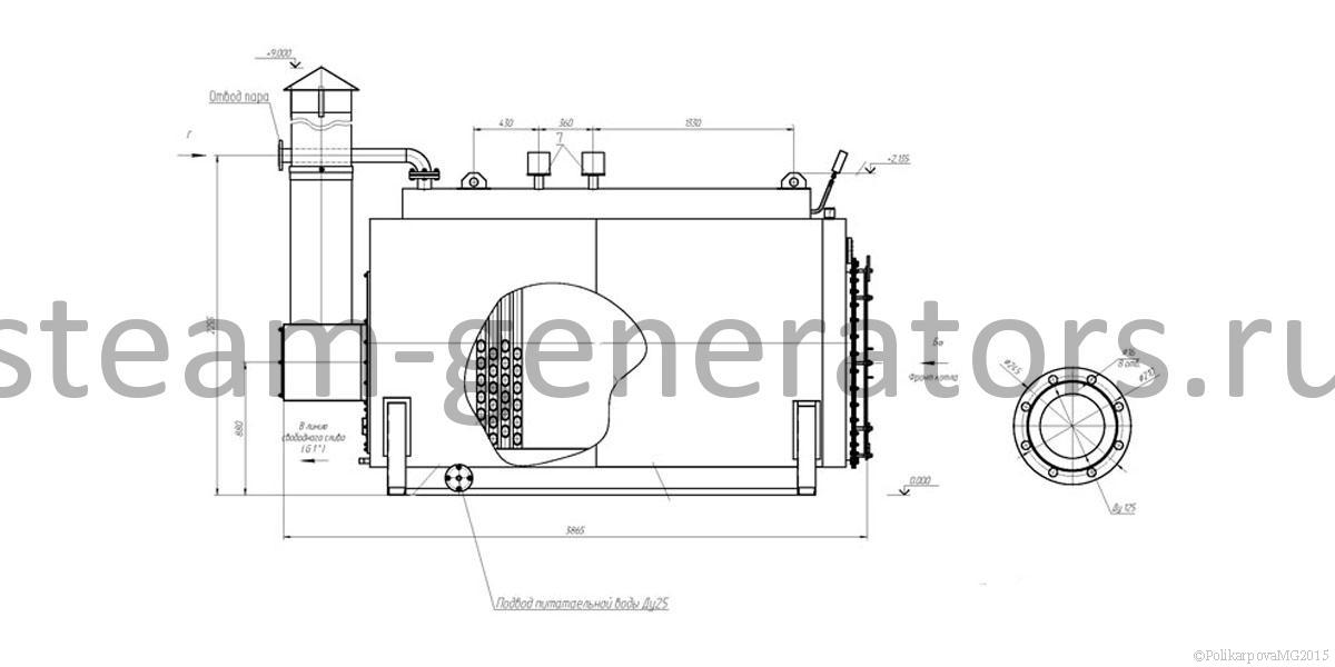 В фронтовой части парового котла на дизеле 700 кг/ч размещается фронтальная плита с амбразурой для установки дизельной горелки. Удаление продуктов сгорания происходит через сборную дымовую трубу.