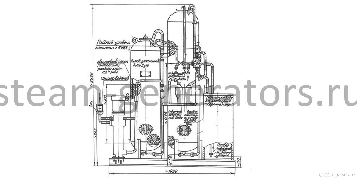 Водоподготовительная установка ВПУ 1 - это скомпонованные и обвязанные трубопроводами на общей раме узлы - фильтр, растворный бак, ижектор подачи раствора реагентов на фильтр, трубопроводная арматура и манометры.