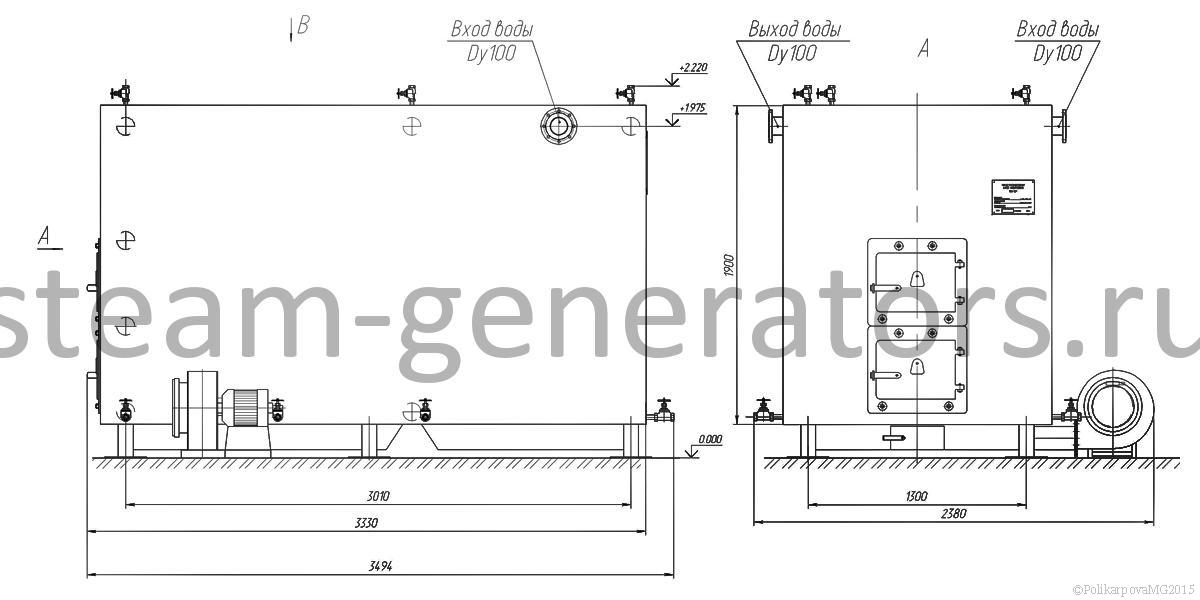 Гладкотрубный, горизонтальной компоновки. Впереди располагается топочное устройство с колосниковой топкой с зольником, далее двухходовой конвективный пакет из змеевиковых труб. Топочное пространство выполнено газоплотным. Газоплотность топки обеспечивается вваркой стальной полосы между охлаждаемых труб котла и исключает присосы холодного воздуха в топочную камеру и зону горения древесного топлива. Воздух для горения топлива подает вентилятор. Снаружи котел имеет каркас с установленной на нем теплоизоляцией и обшитый стальными листами. Изоляция котла обеспечивает температуру наружной стенки не более 30 °С, выполняется из плит ПТЭ, устанавливаемых на трубную систему, обшитых сверху стальным листом. Сверху конвективной части люк для очистки. На фронте устанавливаются две топочные двери, одна над другой.