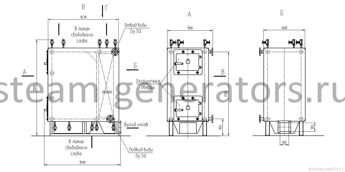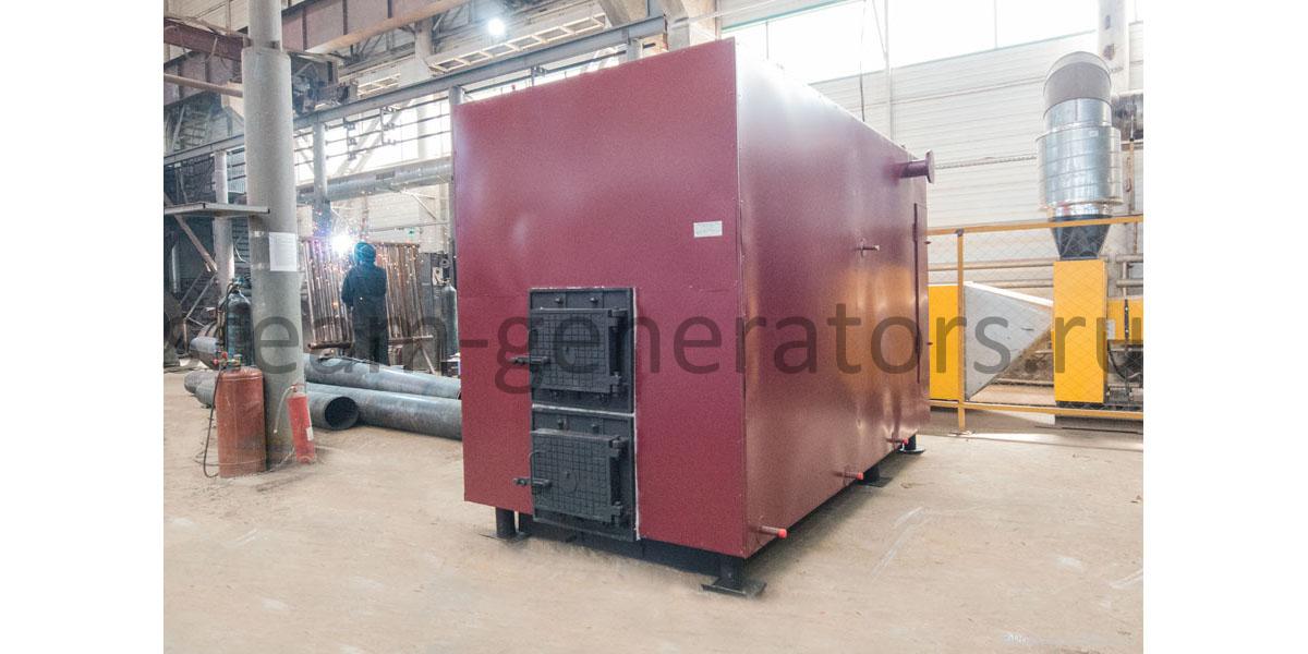 Гладкотрубный, горизонтальной компоновки. Впереди располагается топочное устройство с колосниковой топкой с зольником, далее двухходовой конвективный пакет из змеевиковых труб. Топочное пространство выполнено газоплотным. Газоплотность топки обеспечивается вваркой стальной полосы между охлаждаемых труб котла и исключает присосы холодного воздуха в топочную камеру и зону горения древесного топлива. Воздух для горения топлива подает вентилятор. Снаружи котел имеет каркас с установленной на нем теплоизоляцией и обшитый стальными листами. Изоляция котла обеспечивает температуру наружной стенки не более 30 °С, выполняется из плит ПТЭ, устанавливаемых на трубную систему, обшитых сверху стальным листом. Сверху конвективной части люк для очистки. На фронте устанавливаются две топочные двери, одна над другой.
