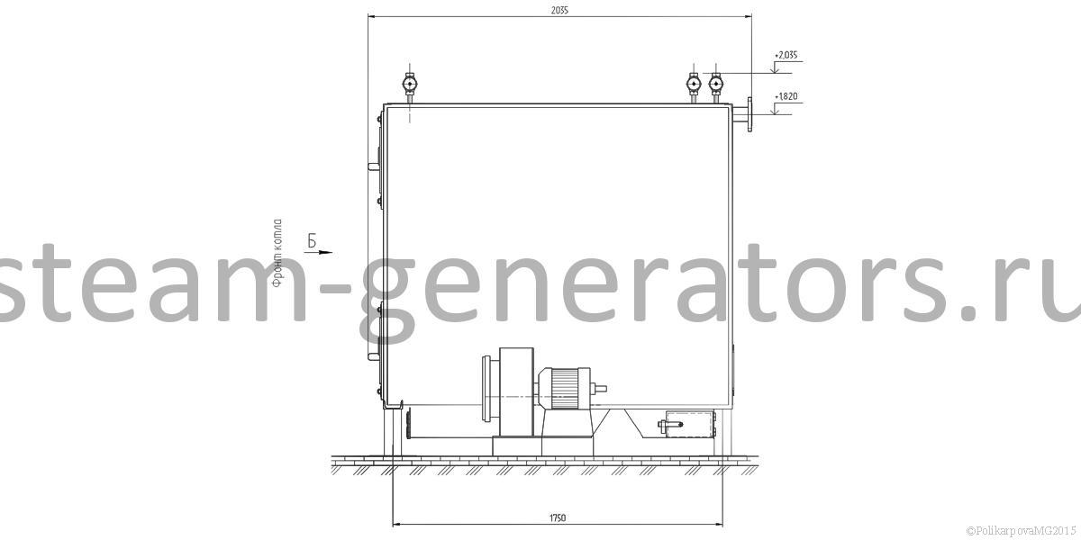 Гладкотрубный, горизонтальной компоновки. Впереди располагается топочное устройство с колосниковой топкой с зольником, далее двухходовой конвективный пакет из змеевиковых труб. Топочное пространство выполнено газоплотным. Газоплотность топки обеспечивается вваркой стальной полосы между охлаждаемых труб котла и исключает присосы холодного воздуха в топочную камеру и зону горения древесного топлива. Воздух для горения топлива подает вентилятор. Снаружи котел имеет каркас с установленной на нем теплоизоляцией и обшитый стальными листами. Изоляция котла обеспечивает температуру наружной стенки не более 30 °С, выполняется из плит ПТЭ, устанавливаемых на трубную систему, обшитых сверху стальным листом. Сверху конвективной части люк для очистки. На фронте устанавливаются две топочные двери, одна над другой.